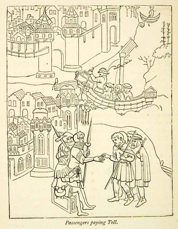 In the middle ages traveling salesmen had to pay toll to a gatekeeper before they had access to the market in the background.